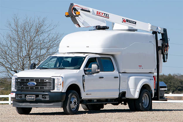 UTEC's combined aerial and splicing lab placed in the bed of a pickup featuring a 19.5' telescopic boom