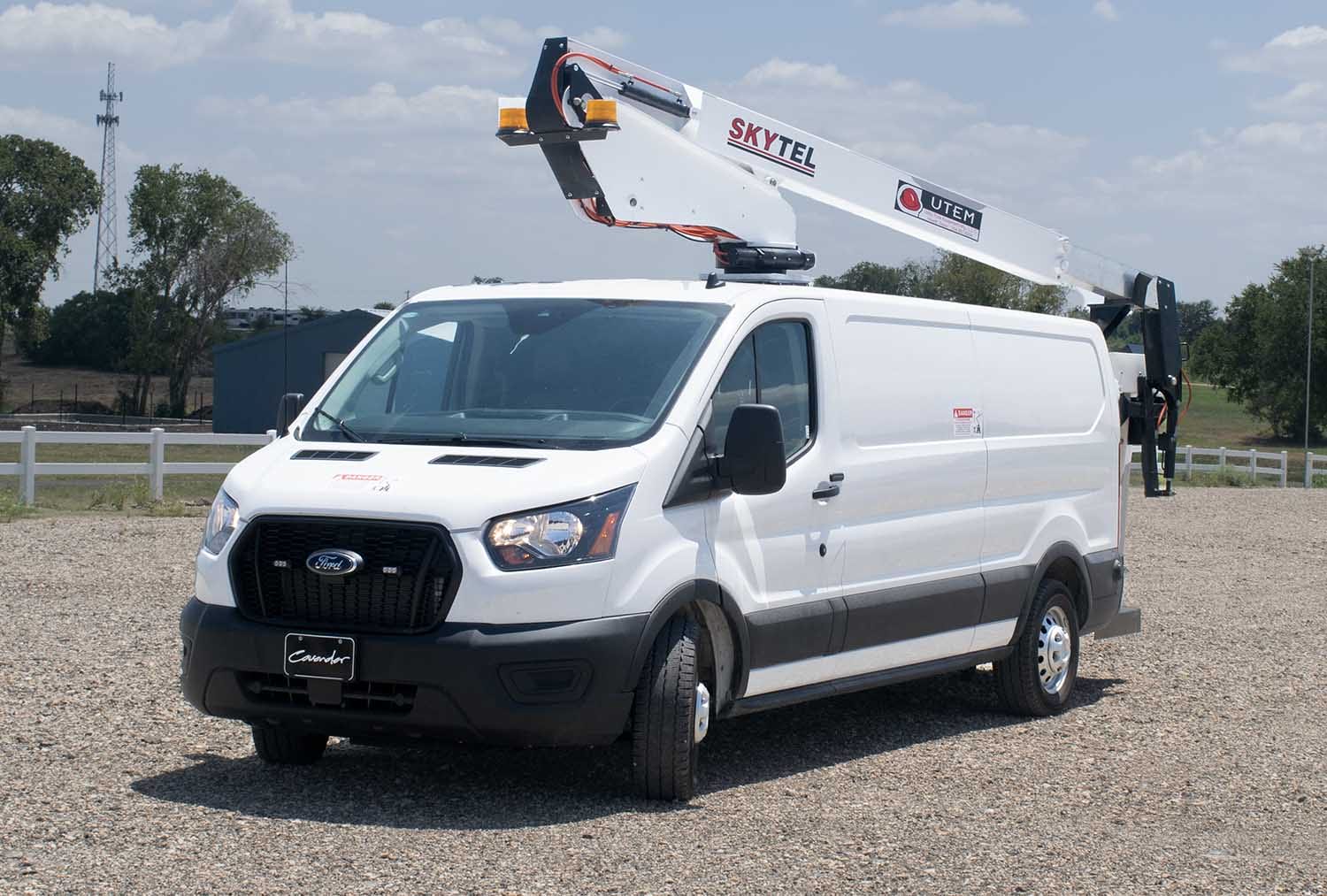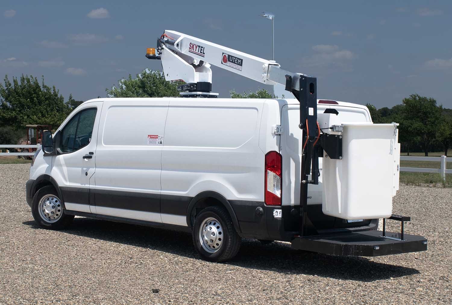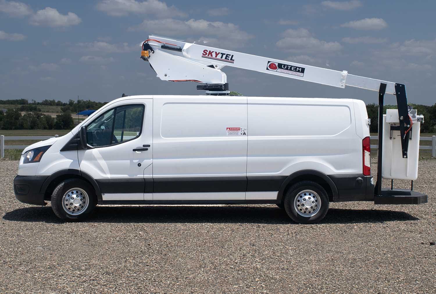 The UTEM SkyVan is a compact, van-mounted aerial lift designed for crews who need maneuverability, storage, and lift power in one tight, efficient package. Built for telecom, lighting, signage, municipalities, and campus facilities, this van bucket truck gives technicians the tools, reach, and workspace they need—without the footprint of a full-size truck.